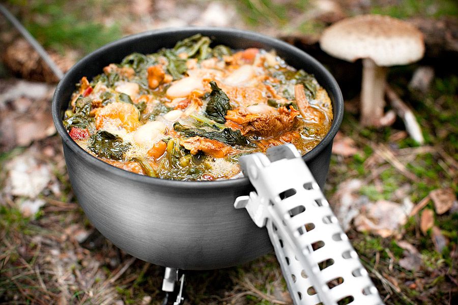 - Lägg spenaten och bönorna i grytan och låt sjuda ytterligare några minuter.