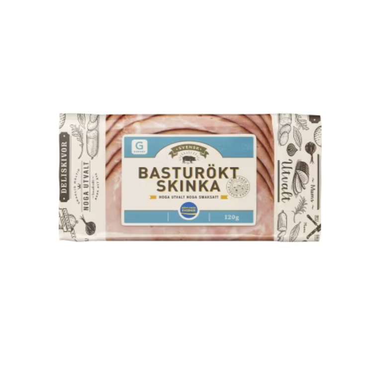 Tunna skivor av basturökt skinka från Sverige. Garanterat gott som smörgåspålägg till frukost och mellanmål. Märket Kött från Sverige visar att köttet i produkten kommer från djur som är uppfödda i Sverige. Produkten är även förädlad och förpackad i Sverige.