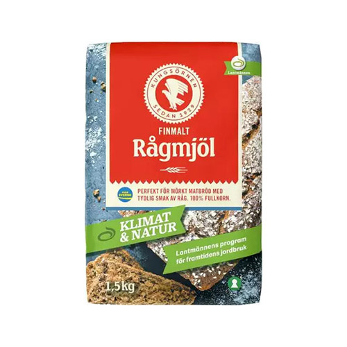 Kungsörnen Rågmjöl Finmalt från Lantmännen kommer från svenska åkrar och är ett fiberrikt mjöl som är malt i vår Malmökvarn. Mjölet fungerar bra om du vill baka mörkare matbröd, eller till skållning som ger lite saftigare bröd. Rågmjöl Finmalt är även en bra grund om du vill sätta din egen surdeg. Om du blandar rågmjölet med Kungsörnen Vetemjöl eller Vetemjöl Special kan du även baka mörka, finkorniga matbröd med härlig rågsmak. Mjölet är även nyckelhålsmärkt och innehåller 100% fullkorn.