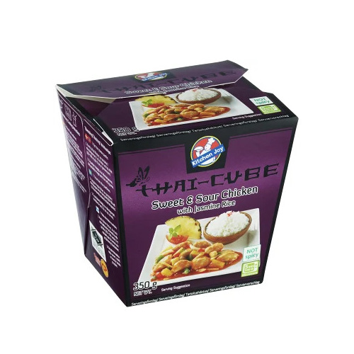 50% kokt jasminris (vatten, 46% varav jasminris, solrosolja), 18% kokt kycklingkött, vatten, socker, tomtpuré, lök, sojaolja, bambuskott, ananas, majsstärkelse, babymajs, SOJABÖNOR, salt, grön paprika, röd paprika, ingefära, VETEMJÖl, tapiockastärkelse, dextros, jästextrakt, OSTRONEXTRAKT, solrosolja, maltodextrin, surhetsreglerande medel (E260), färg (E160c).
