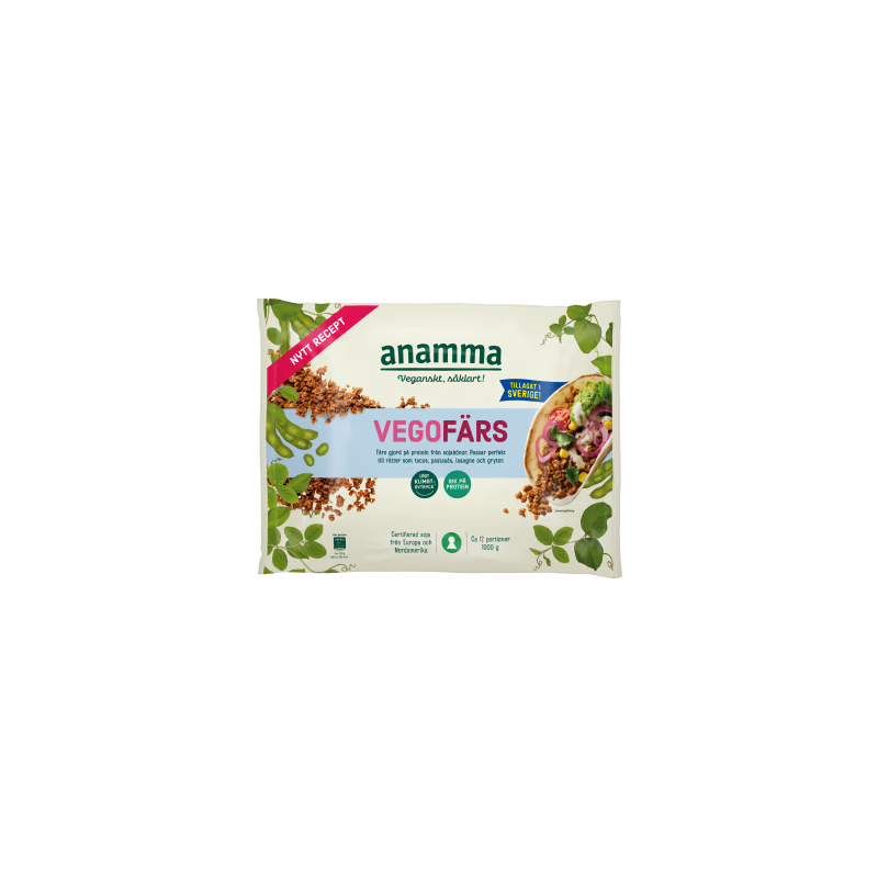 Vegansk färs tillverkad i Sverige. Produkten är baserad på sojaprotein och är fri från gluten. Nyckelhålsmärkt.