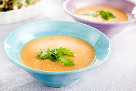 - Finfördela med mixerstav eller i mixer. Salta och peppra. Rör i crème fraiche. Garnera med ruccola.