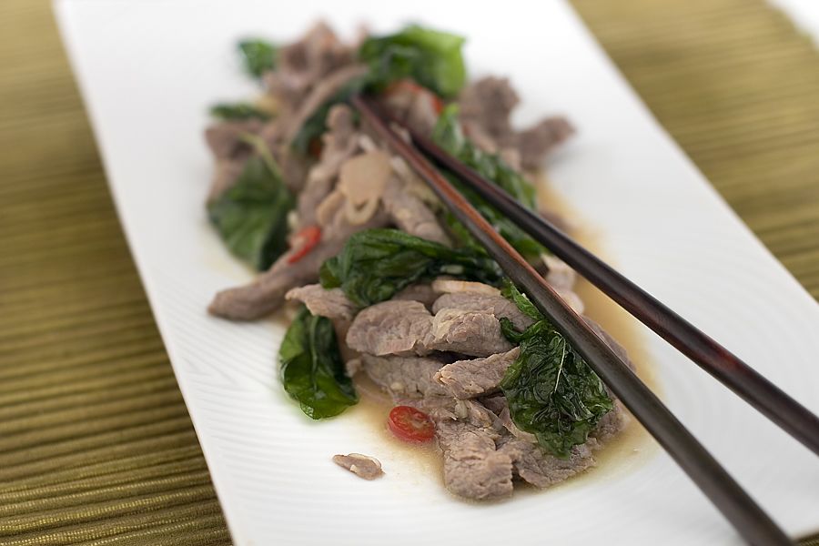 - Hetta upp (wok-)panna med olja på högsta värme. När fettet är riktigt hett, fritera basilikabladen i cirka 1 minut, tills de blivit krispiga men inte brända. Ta ur bladen och låt rinna av på hushållspapper.